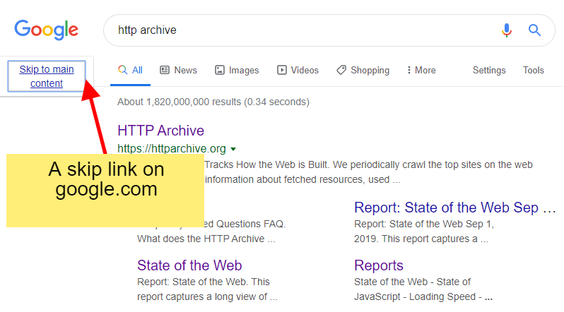 スキップリンクの動作を試す事ができます! シンプルにGoogle検索を実行し、検索結果ページが表示されたらすぐに「Tab」キーを押します。図9.7のような、事前に隠されたリンクが表示されます。