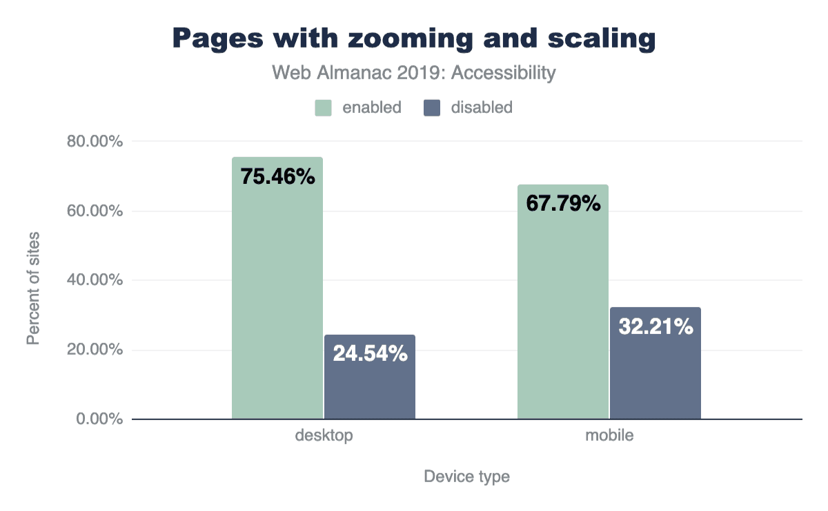 悲しいことに、開発者はこの機能を誤用しすぎており、モバイルサイトの3つのうち1つ(32.21%)でこの機能を無効化しています。さらにApple(iOS 10の時点)でWeb開発者がズームを無効化できなくなってしまいました。モバイルSafariは純粋にタグを無視します。すべてのサイトは新しいiOSデバイスでズームとスケーリングができます。