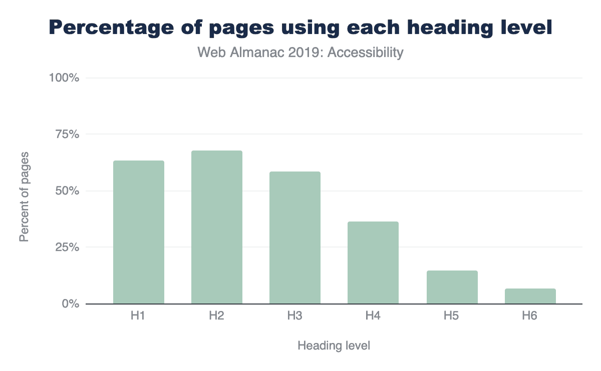 スクリーンリーダーを使うユーザーの混乱を避けるために、見出しのレベルを飛ばさないようにしてください。たとえば、H2をスキップして、H1の次にH3を使うのは止めてください。なぜこれが重要なのか? それはスクリーンリーダーを使うユーザーが、予期せぬ変化からコンテンツを見逃したと勘違いしてしまうためです。このような場合、本当は見逃しがないにもかかわらず、見逃している可能性があるものを探し始めてしまいます。あわせて、より一貫したデザインを維持することで、すべての読者を支援します。