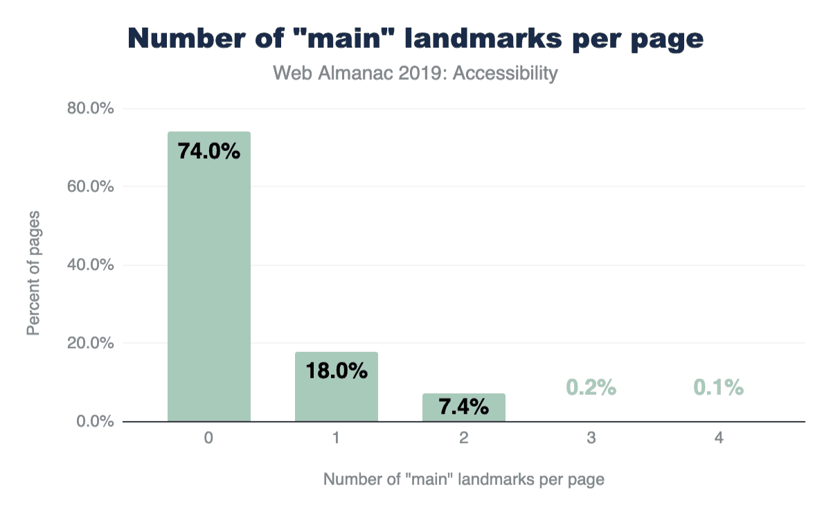 ページの4分の1(26.03%)にだけmainランドマークが含まれていることが判明しました。さらに驚くべきことに、8.06%のページに複数のmainランドマークが誤って含まれているため、ユーザーは実際のメインコンテンツがどのランドマークなのかを推測する必要が出ていました。