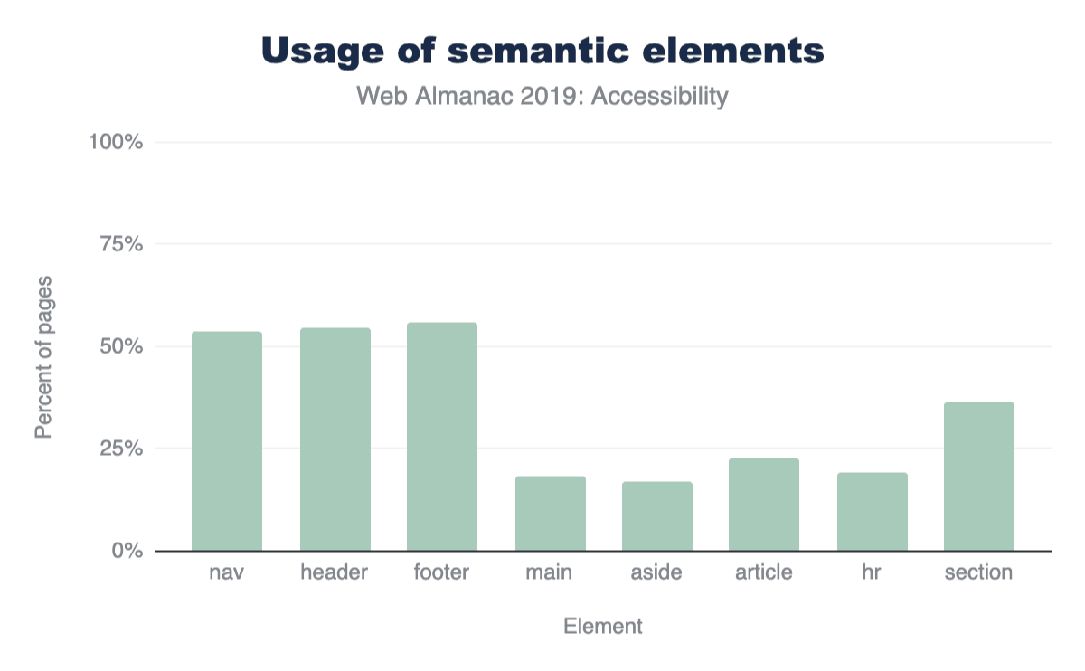 <header>、<footer>、<navigation>、<main>などの要素は特定の種類のコンテンツがどこにあるか明示的にして、ユーザーがそのページへ素早く飛ぶことを可能にします。これらはWeb全体で幅広く使われており、ほとんどがページの50%以上で使われています。(<main>は外れ値です。)