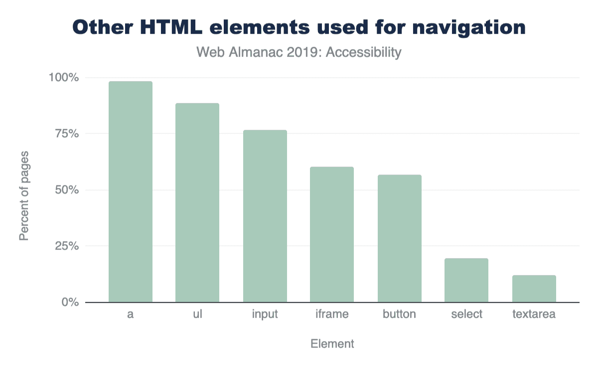 フォームへの入力は私達が毎日行う沢山行う作業です。ショッピングや旅行の予約、仕事の申込みなど、フォームはユーザーがWebページと情報を共有する主な方法です。そのため、フォームを便利にすることは非常に重要です。これを達成するための簡単な方法は、各入力にラベルを提供することです(<label>要素やaria-labelまたはaria-labelledbyを用いて)。悲しいことに、すべてのフォーム入力にラベルを提供しているのページは22.33%しかありませんでした。つまり、5ページあるうちの4ページは非常に記入が難しいフォームを持っています。