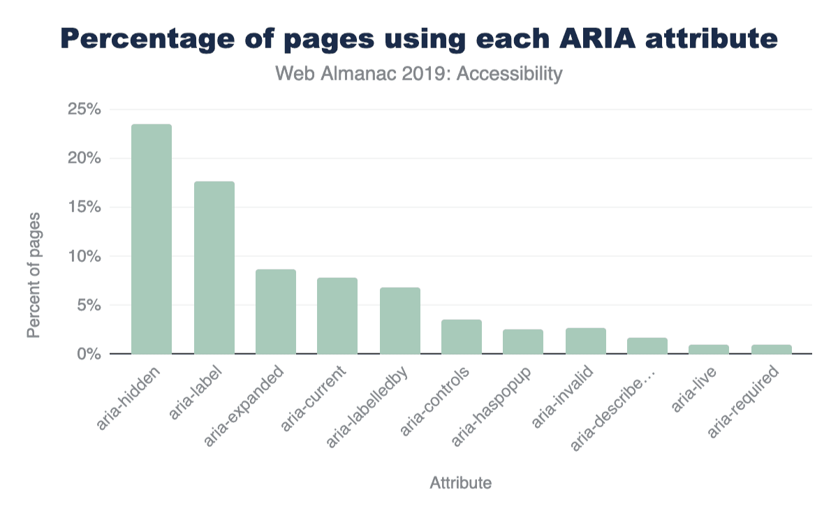 ARIAを適切かつ正しく使うのは難しい場合があります。例えば、ARIA属性を使っているページでは12.31%の属性に無効な値が割り当てられていました。ARIA属性の利用に誤りがあると、ページに視覚的な影響が及ばないため問題になります。これらの間違いは自動検証ツールを使っても検出できますが、一般的には実際の支援ソフトウェア(スクリーンリーダーなど)を実際に使う必要があります。この節ではARIAがWeb上でどのように使われているか、特に標準のどの部分が最も普及しているのかを検証していきます。