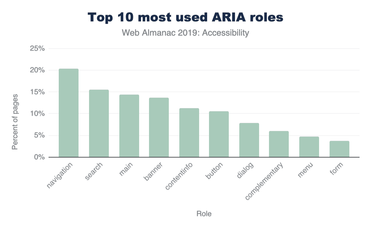 スクリーンリーダーを使っているユーザーはダイアログへのアクセスが難しく、見るからにそれがダイアログロールその相対的な人気となっています。そのため、分析されたページの約8%で挑戦しはじめているのを見るのは興奮します。繰り返しますが、これはいくつかのUIフレームワークを使った結果に思えます。