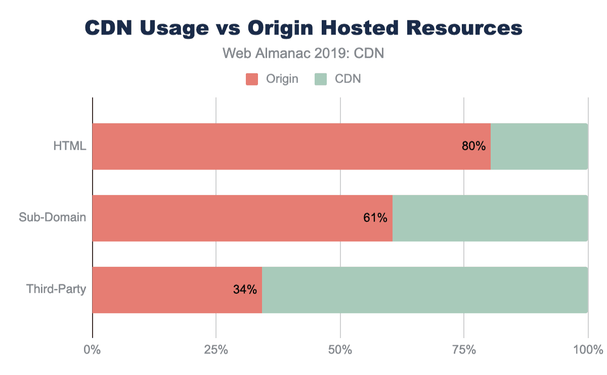 Steve SoudersによるCDNの使用の推奨は、12年前と同じように今日でも有効ですがCDNを介してHTMLコンテンツを提供しているサイトは20%のみであり、リソースにCDNを使用しているサイトは40%のみです。それらの使用法はさらに成長します。