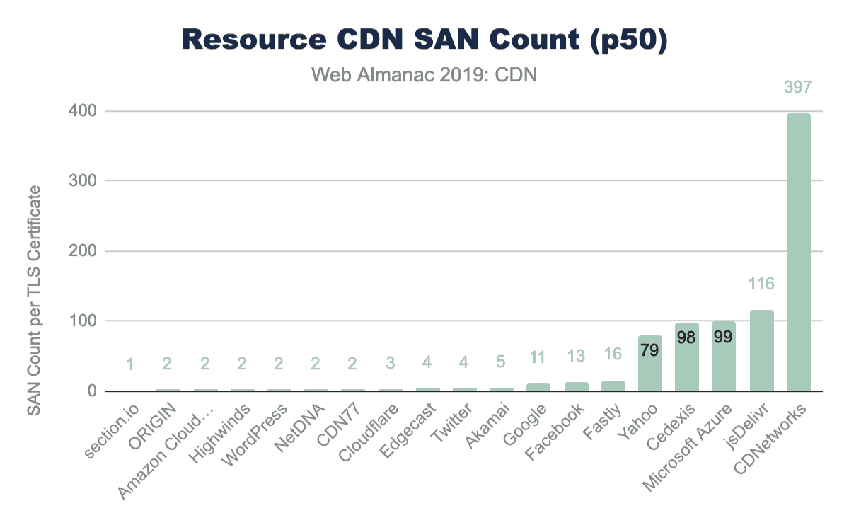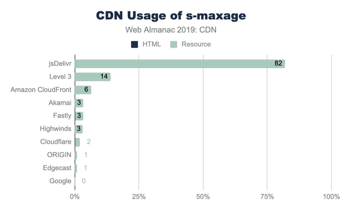 s-maxageディレクティブは、応答をキャッシュできる期間をプロキシに通知します。 Web Almanacデータセット全体で、jsDelivrは複数のリソースで高いレベルの使用が見られた唯一のCDNです。これは、jsDelivrのライブラリのパブリックCDNとしての役割を考えると驚くことではありません。他のCDNでの使用は、個々の顧客、たとえばその特定のCDNを使用するサードパーティのスクリプトまたはSaaSプロバイダーによって推進されているようです。