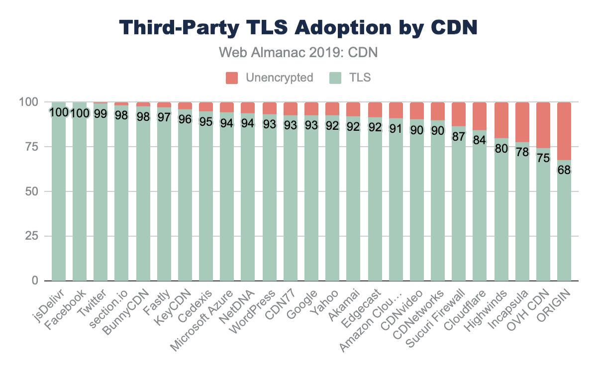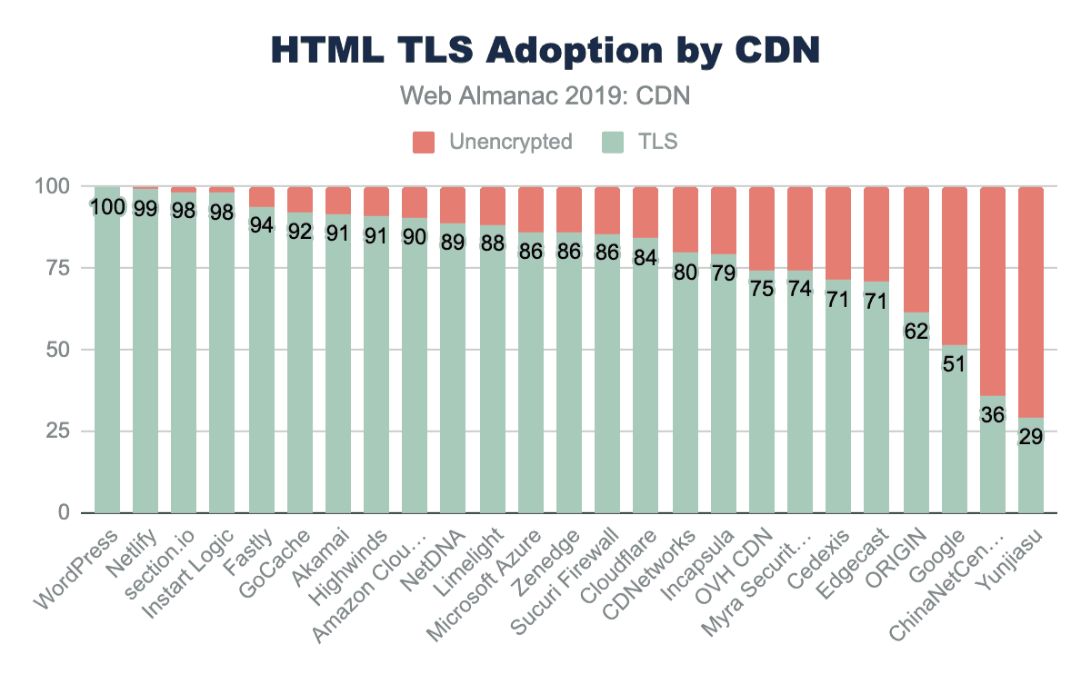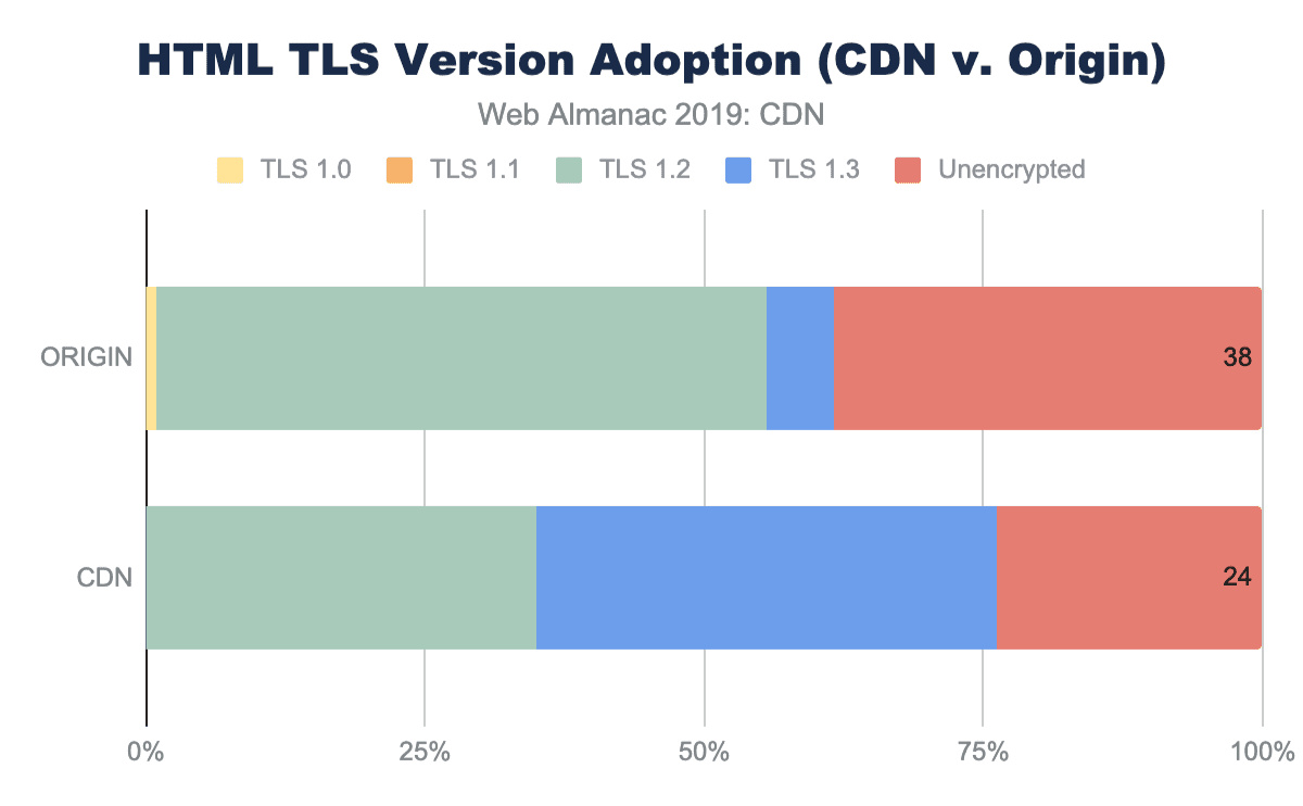 TLSおよびRTTのパフォーマンスにCDNを使用することに加えて、TLS暗号およびTLSバージョンのパッチ適用および採用を確実とするため、CDNがよく使用されます。一般に、メインHTMLページでのTLSの採用は、CDNを使用するWebサイトの方がはるかに高くなっています。 HTMLページの76%以上がTLSで提供されているのに対し、originホストページからは62%です。