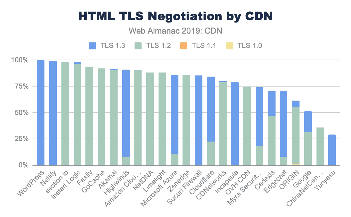このTLSの一般的な採用に加えて、CDNの使用では、TLS1.3などの新しいTLSバージョンの採用も増えています。