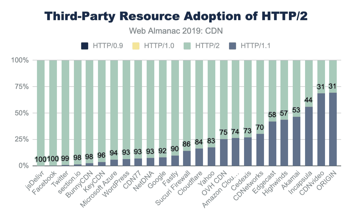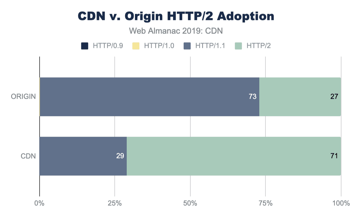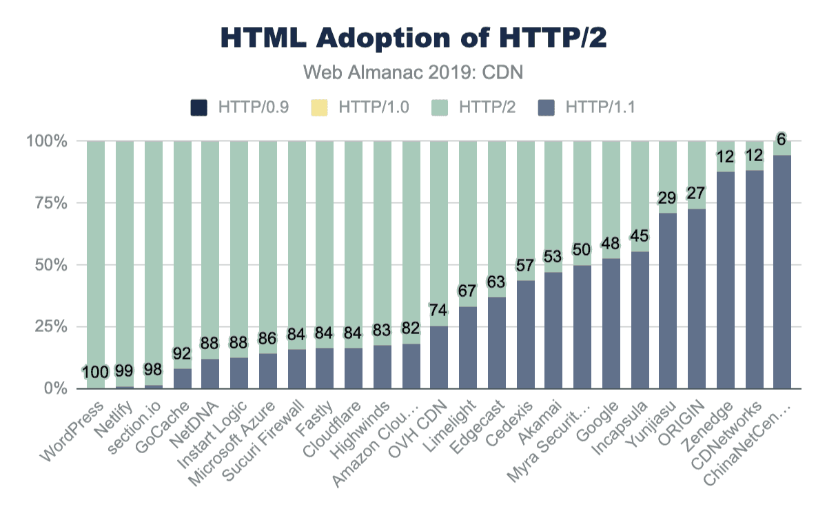 RTT管理とTLSパフォーマンスの向上に加えて、CDNはHTTP/2やIPv6などの新しい標準も有効にします。ほとんどのCDNはHTTP/2のサポートを提供し、多くはまだ標準以下の開発HTTP/3の早期サポートを示していますが、これらの新機能を有効にするかどうかは依然としてWebサイト所有者に依存しています。変更管理のオーバーヘッドにもかかわらず、CDNから提供されるHTMLの大部分ではHTTP/2が有効になっています。