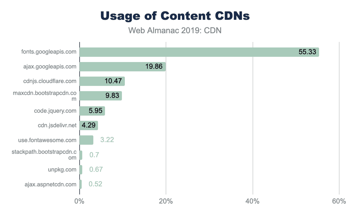 GoogleフォントはコンテンツCDNの中で最も人気があり、55%のWebサイトで使用されています。非フォントコンテンツの場合、Google API、CloudflareのJS CDN、およびBootstrapのCDNが次に人気です。