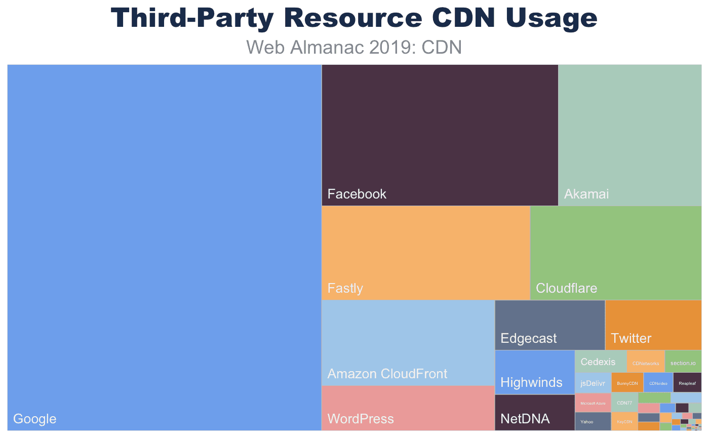 上位CDNプロバイダーの構成は、サードパーティのリソースに対して劇的に変化します。サードパーティのリソースをホストするCDNが頻繁に監視されるだけでなく、Facebook、Twitter、Googleなどの目的に合ったCDNプロバイダーも増加しています。