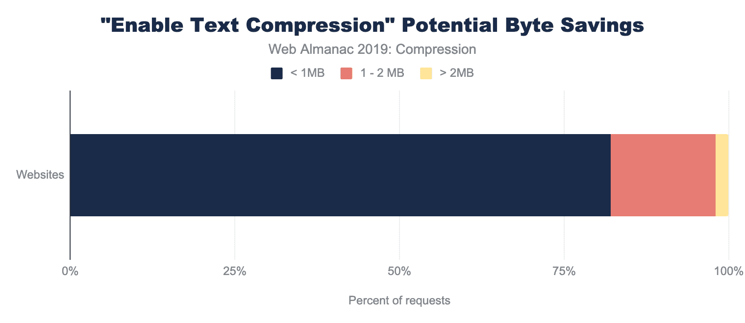 Lighthouseは、テキストベースの圧縮を有効にすることで、保存できるバイト数も示します。テキスト圧縮の恩恵を受ける可能性のあるサイトのうち、82%がページの重さを最大1MB削減できます!