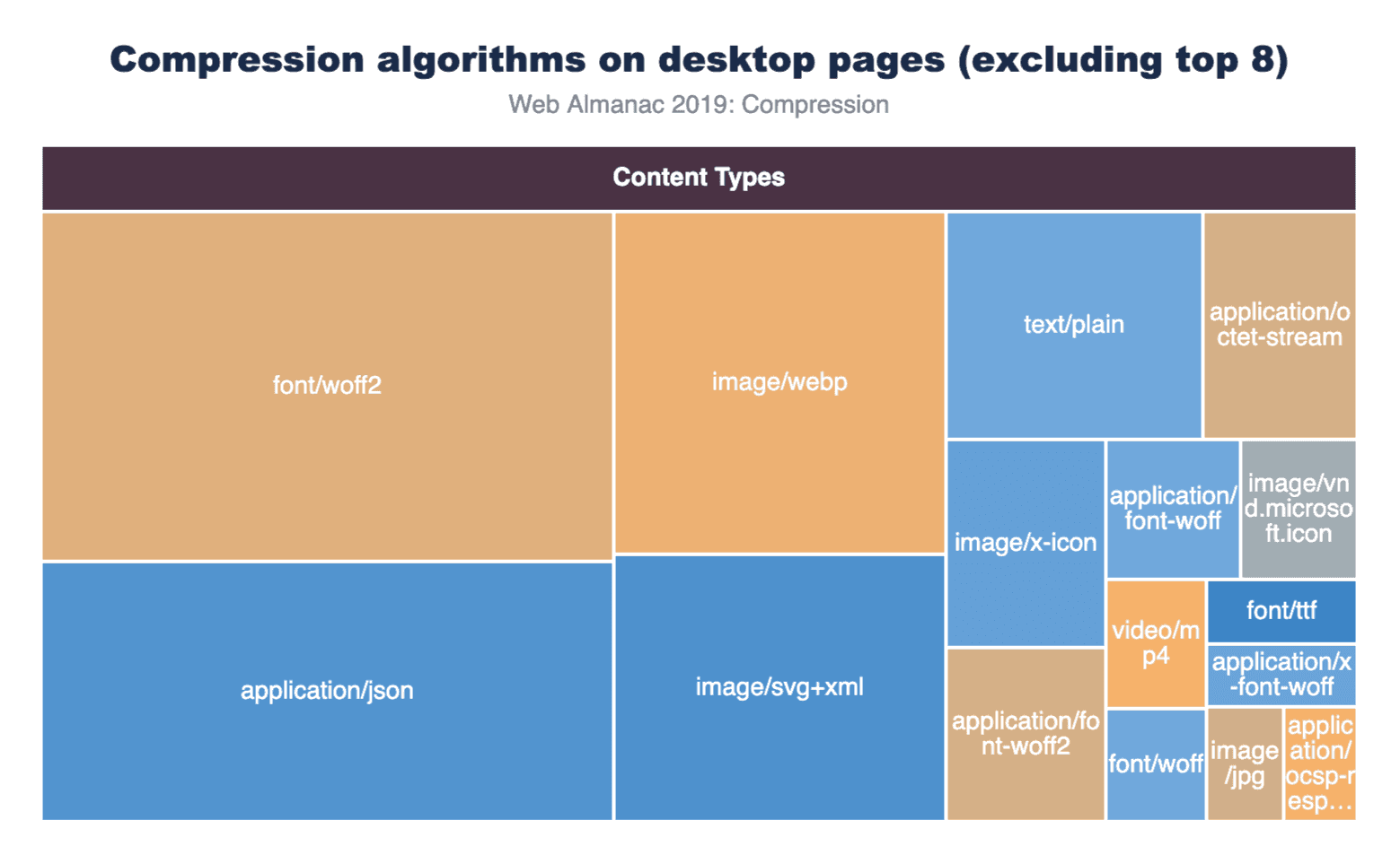 次のグラフでは、上位25のコンテンツタイプが、リクエストの相対数を表すボックスサイズで表示されています。各ボックスの色は、これらのリソースのうちどれだけ圧縮されて提供されたかを表します。ほとんどのメディアコンテンツはオレンジ色で網掛けされていますが、これはGzipとBrotliにはほとんどまたはまったく利点がないためです。テキストコンテンツのほとんどは、それらが圧縮されていることを示すために青色で網掛けされています。ただし、一部のコンテンツタイプの水色の網掛けは、他のコンテンツタイプほど一貫して圧縮されていないことを示しています。