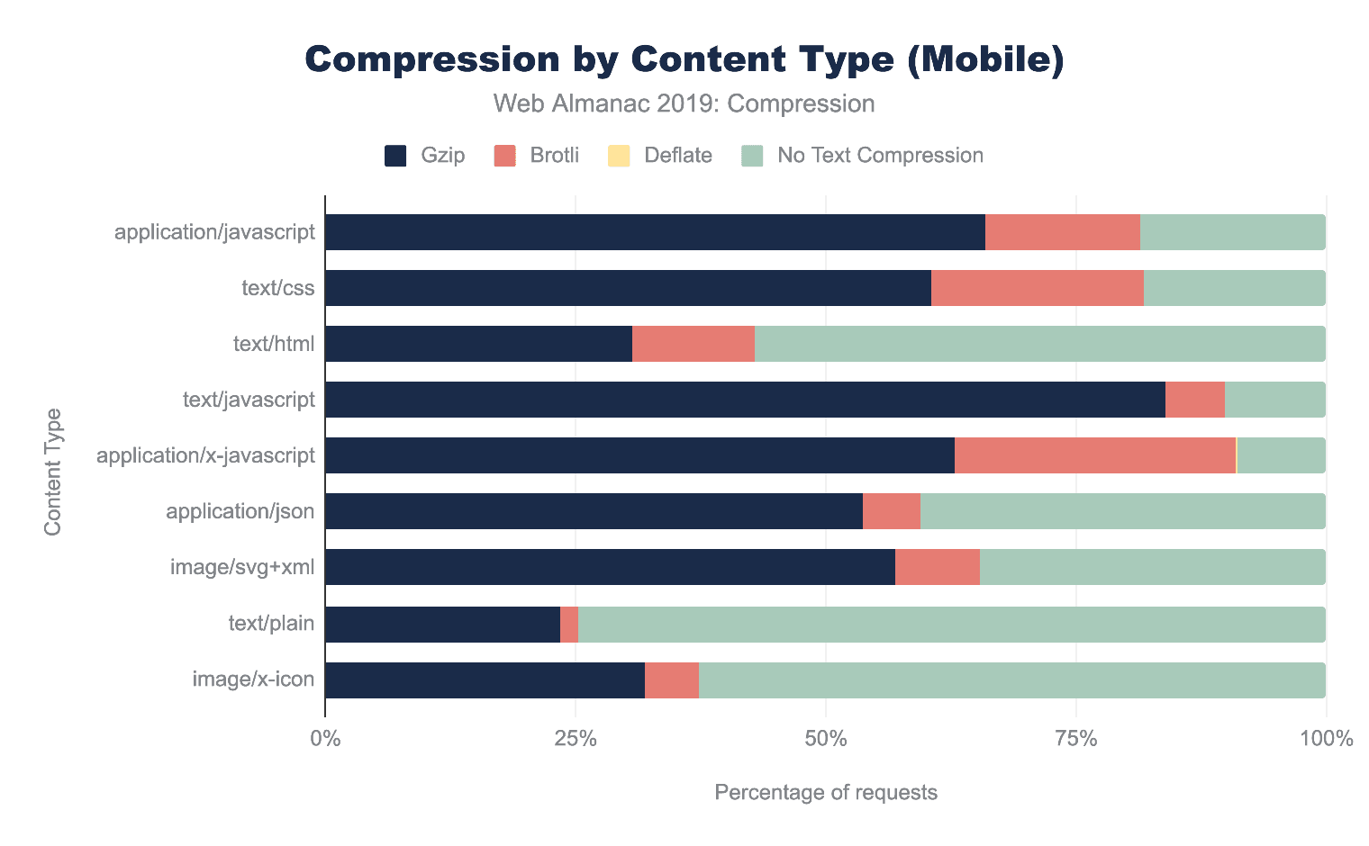 圧縮率が最も低いコンテンツタイプには、application/json、text/xml、およびtext/plainが含まれます。これらのリソースは通常、XHRリクエストに使用され、Webアプリケーションが豊かな体験を創造するために使用できるデータを提供します。それらを圧縮すると、ユーザー体験は向上する可能性があります。 image/svg+xmlやimage/x-iconなどのベクターグラフィックスは、テキストベースと見なされることはあまりありませんが、これらを使用するサイトは圧縮の恩恵を受けるでしょう。