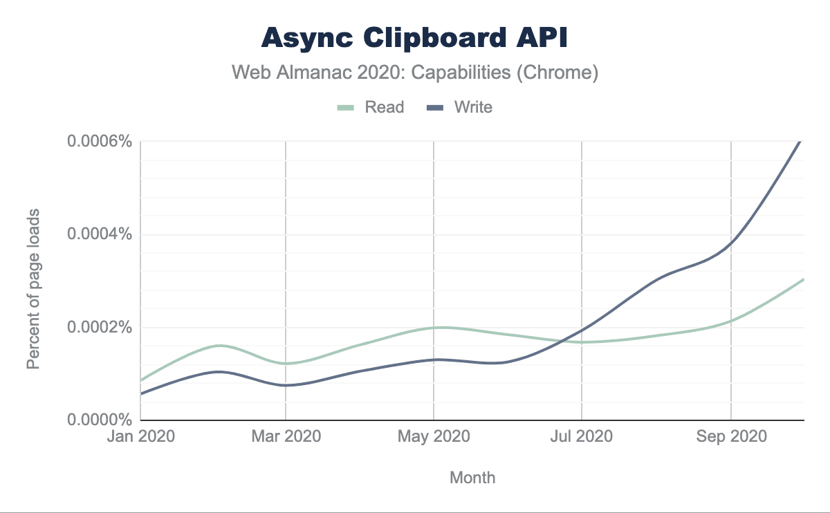 非同期クリップボードAPIは比較的新しいAPIなので、現在のところ利用率はかなり低いです。2020年3月、SafariはSafari 13.1で非同期クリップボードAPIのサポートを追加しました。2020年の間に、read() APIの使用量は増加しました。2020年10月には、Google Chromeの全ページロードの0.0003%の間にAPIが呼び出されました。