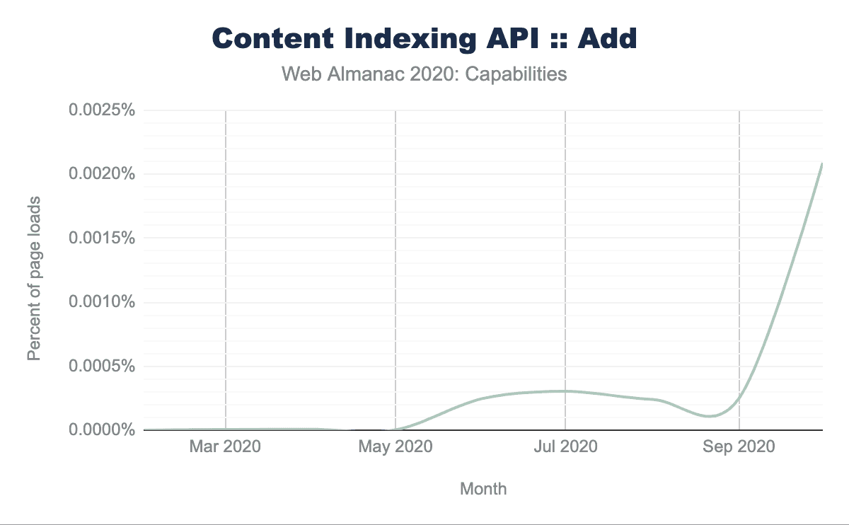 コンテンツインデックスAPIは、2020年7月にChrome 84で提供が開始されました。提供直後は、Chromeでのページロードの約0.0002%の間にAPIが使用されていました。2020年10月時点では、この値はほぼ10倍に増加しています。