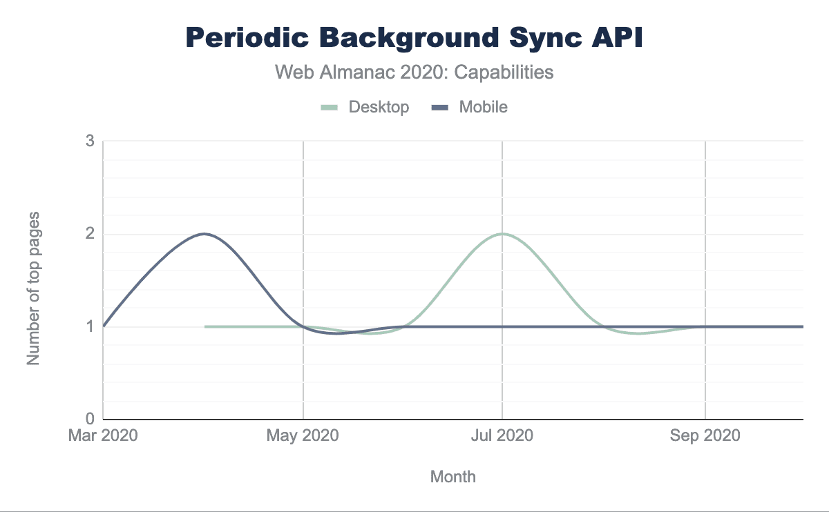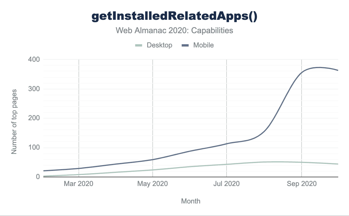 2020年の間に、getInstalledRelatedApps()APIはモバイルWebサイトで着実な成長を示しています。10月には、HTTP Archiveによって追跡された363のモバイルページがこのAPIを利用していました。デスクトップページでは、APIの成長はそれほど速くありません。これは現在AndroidストアとMicrosoftストアがWindows向けに提供しているアプリよりもかなり多くのアプリを提供していることにも起因している可能性があります。