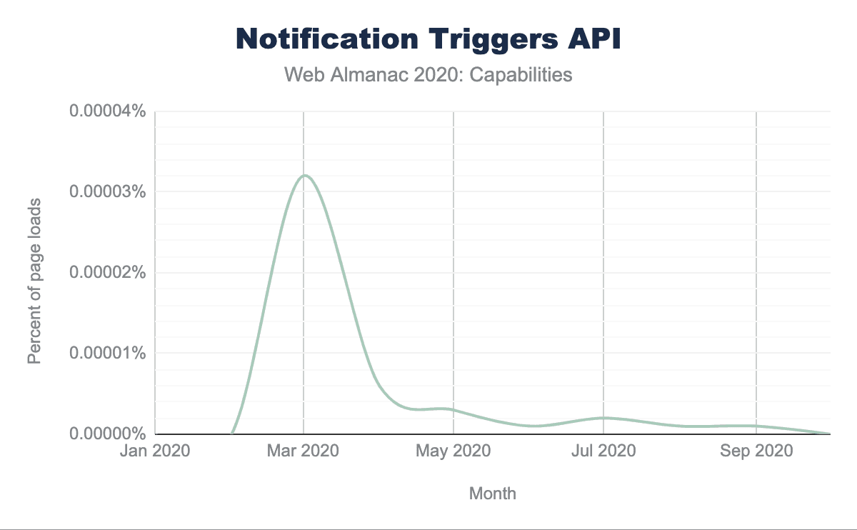 ふぐチームは、Chrome 80から83までのオリジントライアルで最初に通知トリガーの実験を行い、その後、開発者からのフィードバックがなかったために開発を一時停止していました。2020年10月にリリースされたChrome 86から、APIは再びオリジントライアルの段階に入っています。これは、2020年3月頃の最初のオリジントライアルでChromeでのページロードの0.000032%で呼び出されるのがピークだった通知トリガーAPIの利用データについても説明しています。