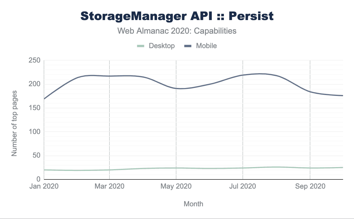 Storage Manager APIは2016年からChrome、2017年からFirefox、そして新しいChromiumベースのEdgeでサポートされています。HTTP Archiveのデータによると、デスクトップページ27,056ページ(0.49%)とモバイルページ34,042ページ(0.48%)でAPIが使用されています。2020年の間に、Storage Manager APIの使用率は増加の一途をたどっています。このことからも、この章では、このインターフェイスが最もよく使われているAPIとなっています。