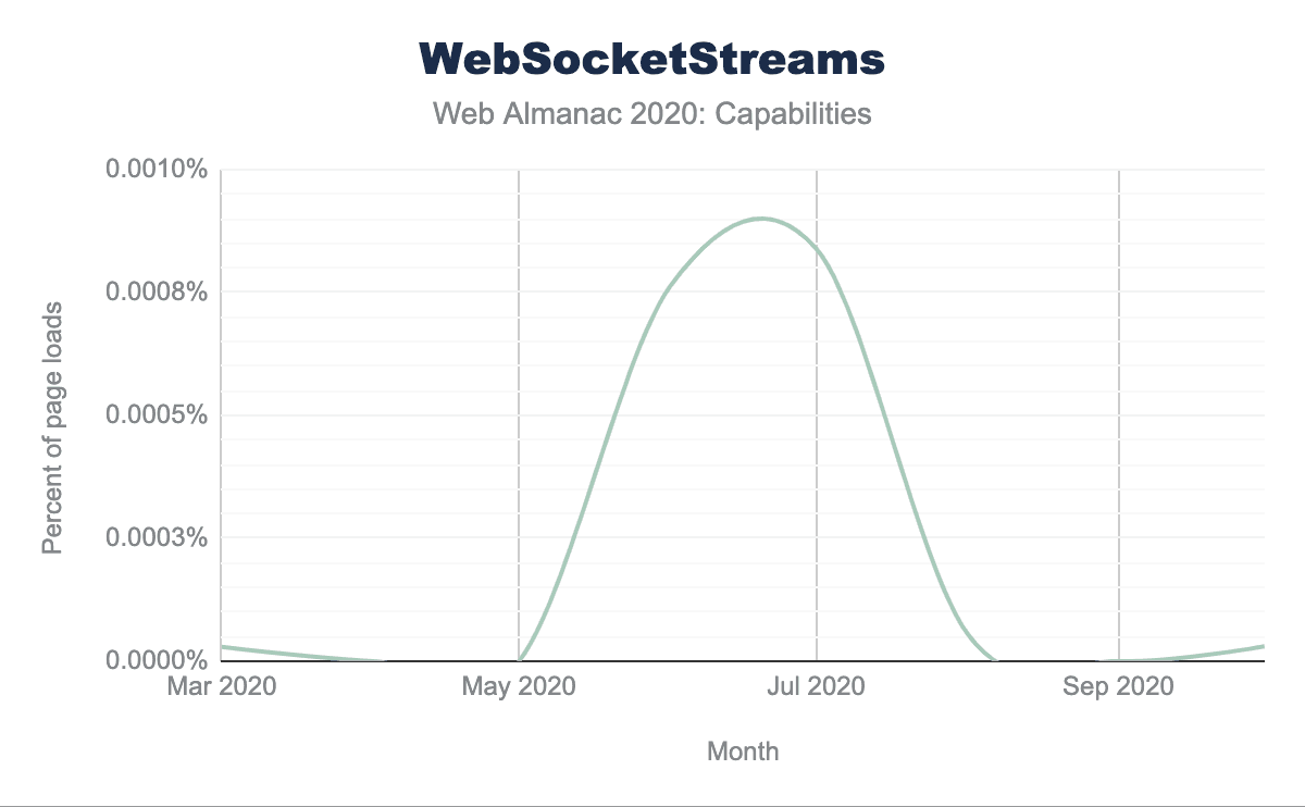 WebSocketStream APIは最初のオリジントライアルを終え、再び実験段階に戻っています。これは、現在このAPIの使用率が非常に低く、ほとんど測定できない理由も説明しています。