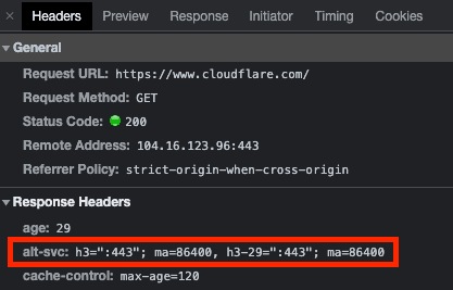 たとえば、2022年9月にhttps://www.cloudflare.comのレスポンスでのalt-svc値は、以下のスクリーンショットに示されるように、h3=":443"; ma=86400, h3-29=":443"; ma=86400です。h3とh3-29は、CloudflareがUDPポート443上でHTTP/3とHTTP/3のIETFドラフト29をサポートしていることを示しています。HTTP/3の発見をDNSルックアップの一部として高速化する提案もあります。詳細についてはこのCloudflareの投稿を参照してください。