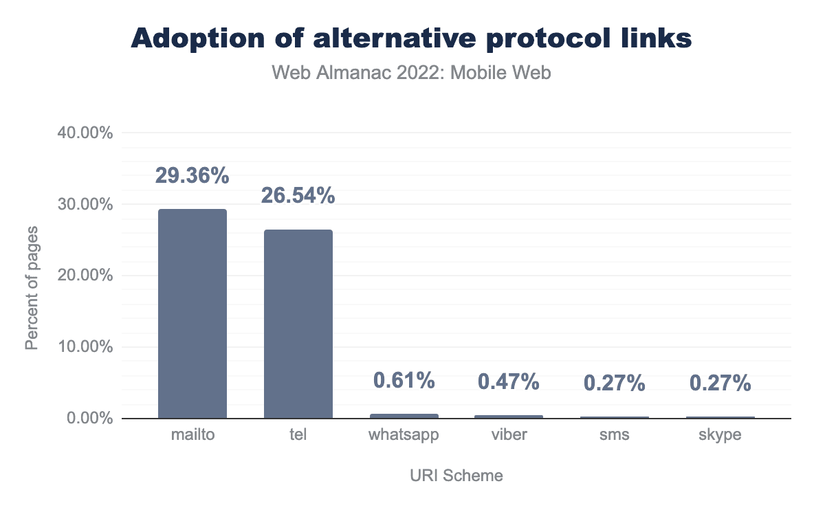 上記の図は、2022年にウェブでどのように異なる代替プロトコルリンクが使用されているかを概説しています。もっとも人気のあるオプションは、メールのためのmailto、電話をかけるためのtel、テキストメッセージを送るためのsms、WhatsApp、Skype、Viberなどの異なるメッセージングサービスのアプリケーション固有のプロトコルです。