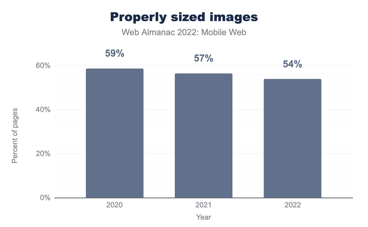 GoogleがCore Web Vitalsプログラムで良好なパフォーマンスを報酬化することに注力しているため、より多くのサイトが画像を最適化すると期待されます。しかし、時間が経つにつれて最適化された画像が減少していることは興味深いです。上の図は、2020年に59%のサイトが適切なサイズの画像を持っていたのに対し、2022年にはその数が54%に減少したことを示しています。