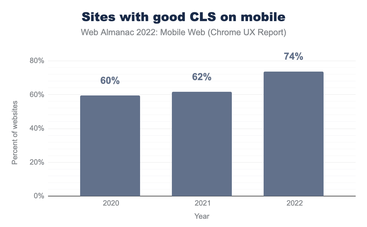 モバイルで「良好」なCLSを持つウェブサイトの割合は、昨年の62%から大幅に改善され、74%になりました。