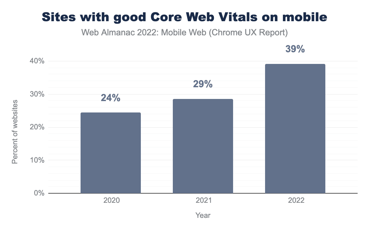上記の図は、Core Web Vitalsが2020年に導入されて以来、ウェブ全体のパフォーマンスがどのように変化したかを示しています。全体として、モバイルウェブサイトは年々着実に改善されています。2022年には、ウェブサイトの39%がモバイルデバイス上で良好なCore Web Vitals体験を提供しています。今年の顕著な変化の原因については、パフォーマンスの章でさらに詳しく調べることができます。