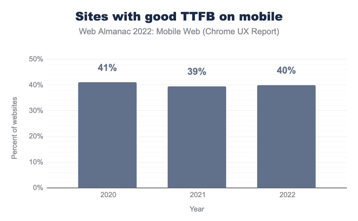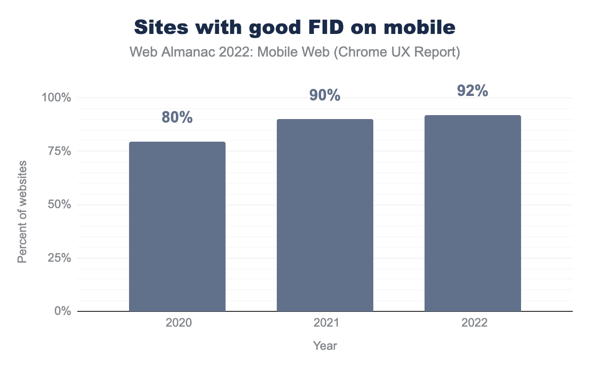 過去3年間で「良好な」FIDを持つモバイルサイトの割合には一貫した成長があり、2020年の80%から2021年の90%、2022年には92%に達しました。