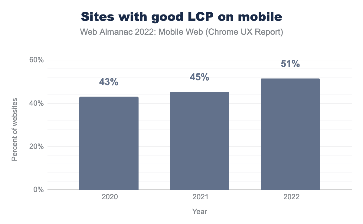 LCPのパフォーマンスは改善しています。2020年には、モバイルサイトの43%が「良好」と評価されたLCPを持っていました。2021年にはこの数値が45%に改善し、2022年には顕著な跳躍があり、51%のモバイルサイトが良好なLCPパフォーマンスを有していました。パフォーマンスの章では、これがなぜ起こったのかについてのいくつかの可能性のある説明を探求します。