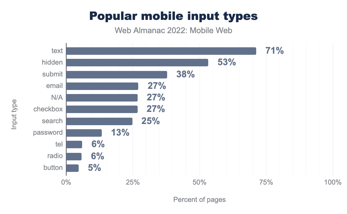 モバイルではデスクトップよりも入力フィールドによるキーボードの変調がより重要ですので、彼らのウェブサイトアーカイブを通じてもっとも人気のあるモバイル入力タイプを追跡しています。2022年では、textが依然としてもっとも人気のある入力タイプで、71%のページで使用されており、これは昨年の73%からわずかに減少しています。次に一般的な入力タイプは、53%のページでhidden、そして38%でsubmitです。