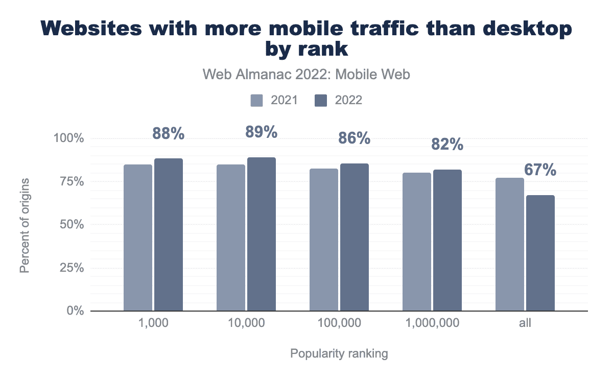 人気ランクが高いサイトでは、モバイルトラフィックがデスクトップトラフィックを上回るサイトの割合が昨年に比べて増加しています。2022年には、もっとも人気のある1,000のサイトのうち88%がデスクトップよりもモバイルデバイスからのトラフィックが多く、2021年の約85%から増加しています。そして、もっとも人気のある10,000のサイトの中で89%がモバイルデバイスからのトラフィックが多く、これは2021年の約86%から増加しています。これは、これらのトップ人気ランキンググループの両方で、デスクトップよりもモバイルトラフィックが多いサイトが約3%増加したことを意味します。