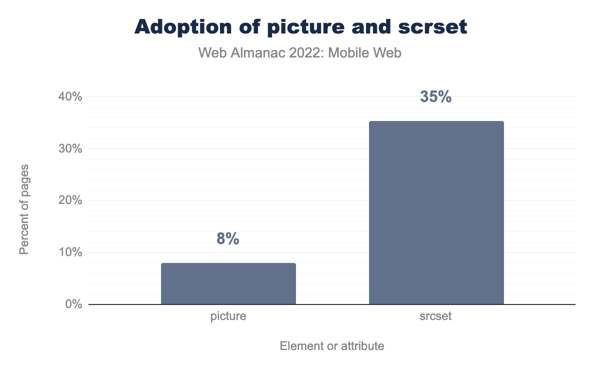 picture要素の採用はモバイルページのわずか8%(昨年の6%から増加)ですが、srcsetは35%に達しています。2021年にはsrcsetの使用が約32%だったので、約3ポイントの成長を見ています。