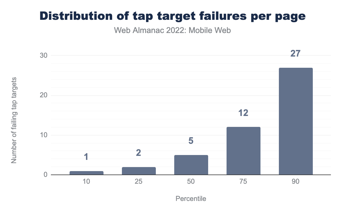 監査に失敗したページは、通常、複数のリンクが失敗しています。失敗したタップターゲットの中央値は5ですが、サイトが失敗する場合、失敗したタップターゲットの数は非常に多いことがあります。最悪の10%のサイトでは、少なくとも27の失敗したタップターゲットがあります。