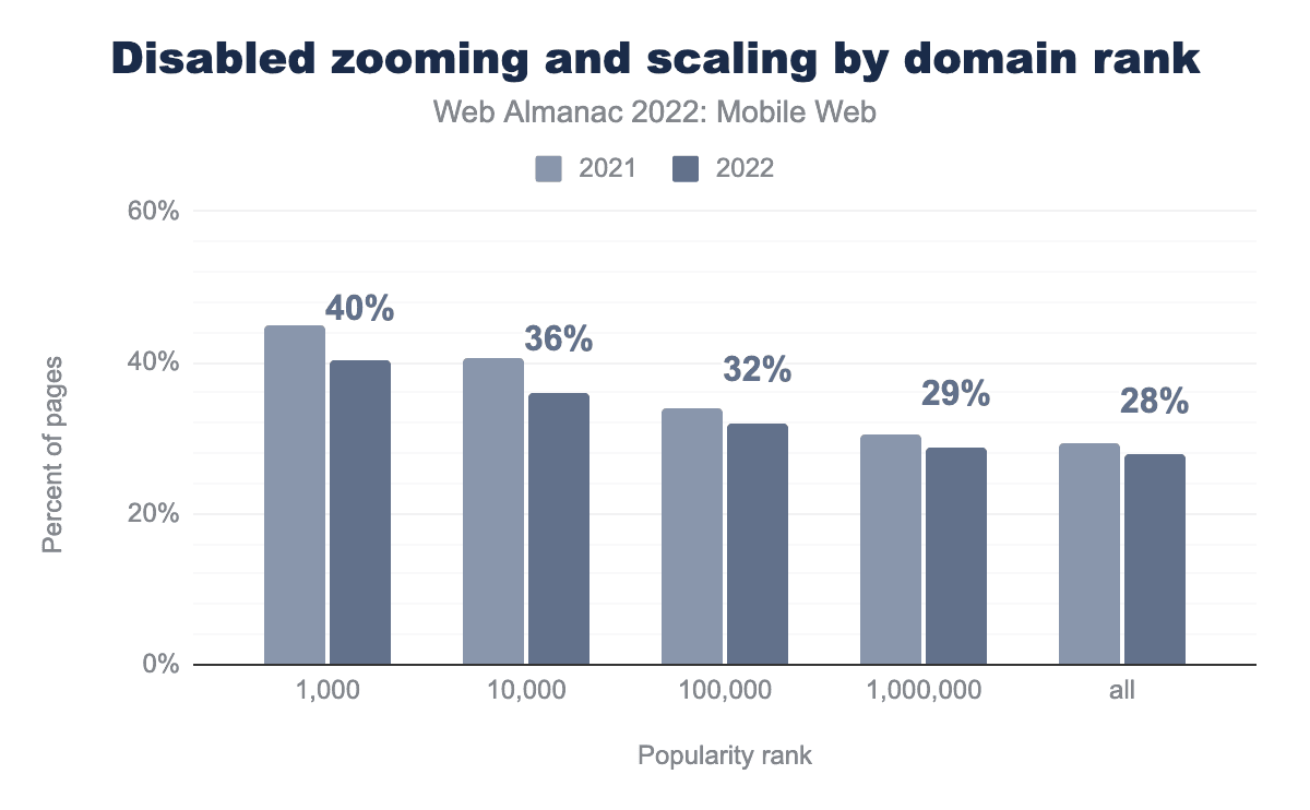 上位1,000のモバイルウェブサイトのうち、40%がズームとスケーリングを無効にしており、これは2021年の約45%から減少しています。上位10,000を見ると、モバイルサイトの36%がスケーリングとズームを無効にしており、これは2021年の約41%から減少しています。データセットに含まれるすべてのサイトを含むもっとも広いランキンググループでは、28%のサイトがズームとスケーリングを防止しており、これは2021年の約29%から減少しています。全体として、このアクセシビリティを制限する設定の普及率はとくにもっとも人気のあるサイトで減少していることがわかりますが、まだ半数以上のサイトがこのタイプの制限的な設定を使用しているという事実は残念です。