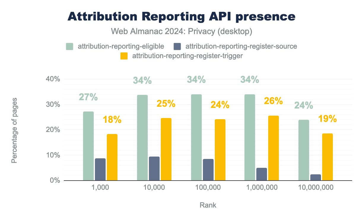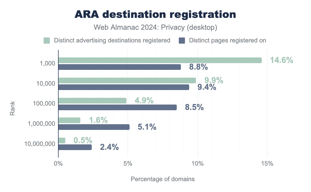 上位1,000のウェブサイトの8.8%のパブリッシャーで、14.6%の異なる広告主がattribution-reporting-register-triggerヘッダーを使用して自身を登録するためにARAを使用していることがわかります。合計で、上位100万(上位1,000万)のウェブサイトの5.1%(2.4%)のパブリッシャーで、1.6%(0.5%)の異なる広告主がARAを採用していることがわかります。これは、広告主の採用と比較して、多くのパブリッシャーがARAを採用していないことを示しています。広告主は、広告クリックに対するユーザーのコンバージョンをアトリビュートするためにARAに依存する必要があるポストCookie時代に備えています。