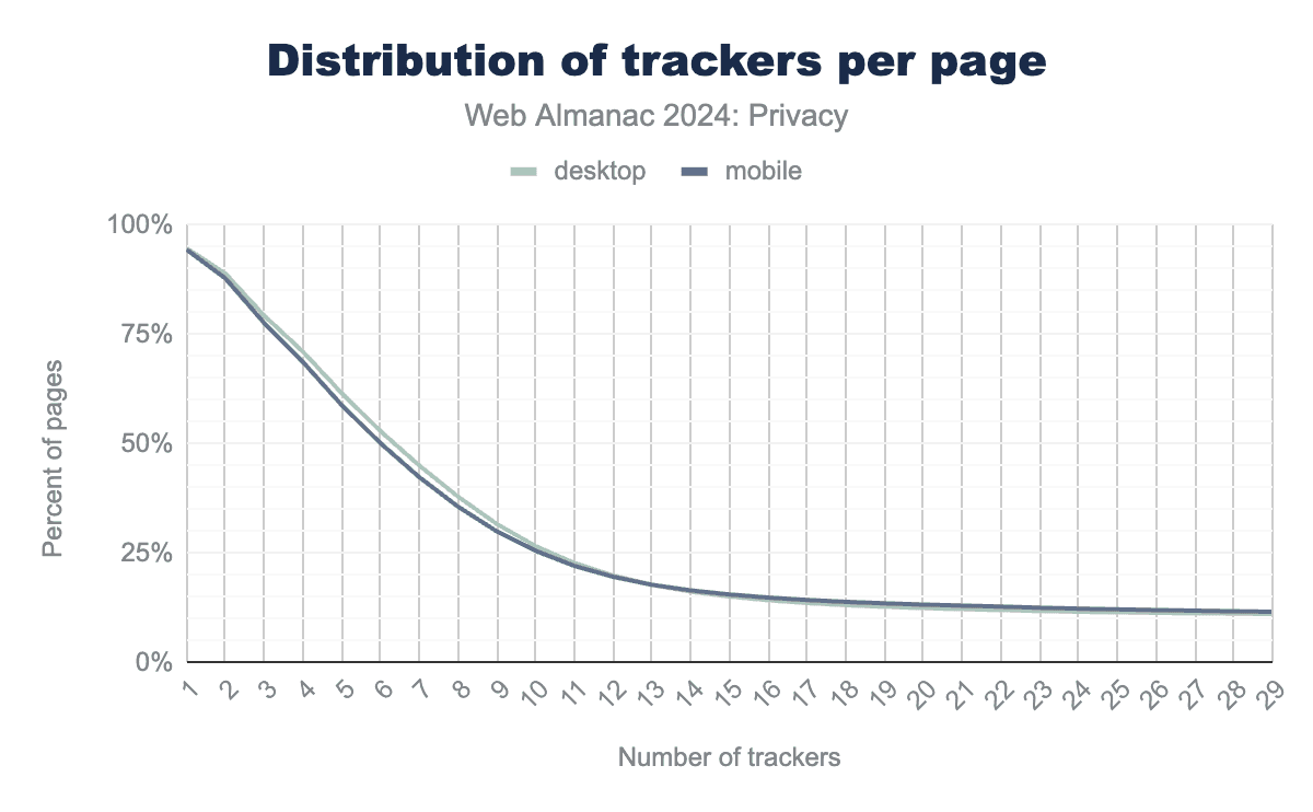 オンライントラッキングは、インターネット上で日常的に行われています。多くのウェブサイトには、自サイト内や複数のサイトにわたってユーザーの活動を記録する、専門のオンラインサービスが含まれています。私たちの調査から、デスクトップウェブサイトの95%とモバイルウェブサイトの94%に、少なくとも1つのトラッカーが含まれていることが明らかになりました。