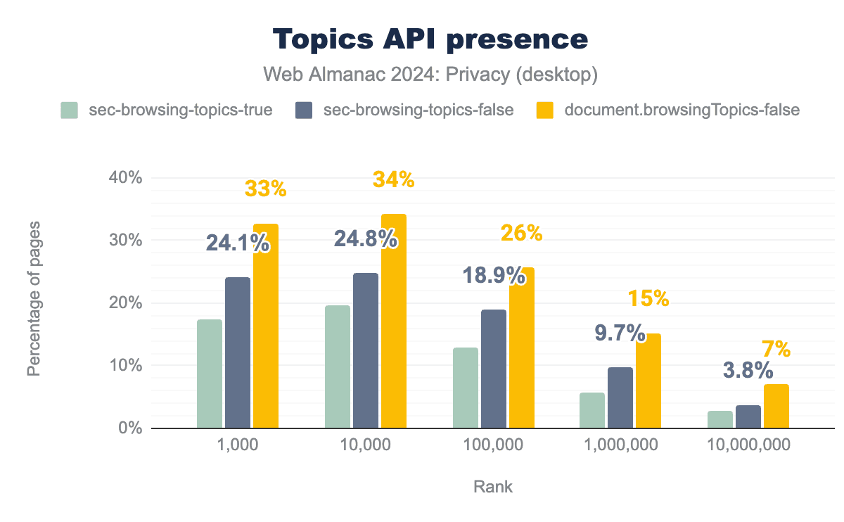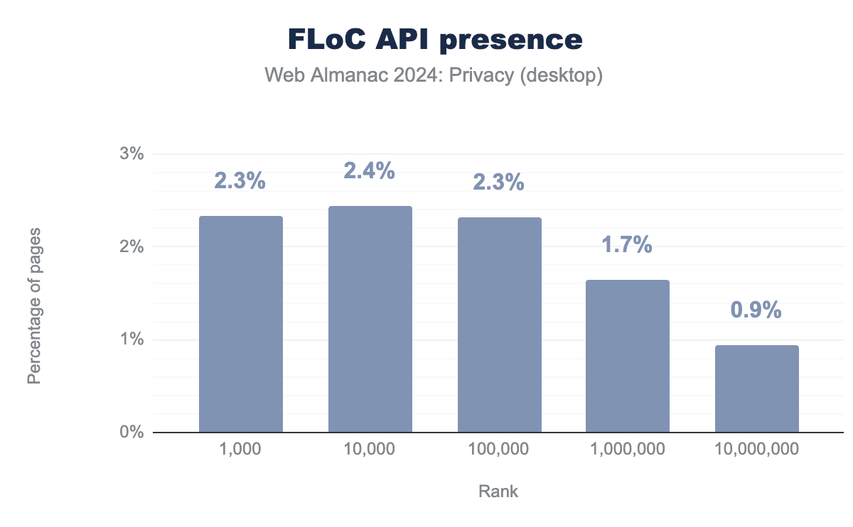 驚くべきことに、Topics APIの前身であるFederated Learning of Cohorts API(FLoC)は、いくつかのプライバシー問題により非推奨とされているにもかかわらず、かなりの数のページにまだ存在していることもわかります。Topics APIは現状を改善しますが、先行研究では、ユーザーのブラウザから返されるトピックを一定期間監視することで、ユーザーの再識別につながる可能性があることが示されています。