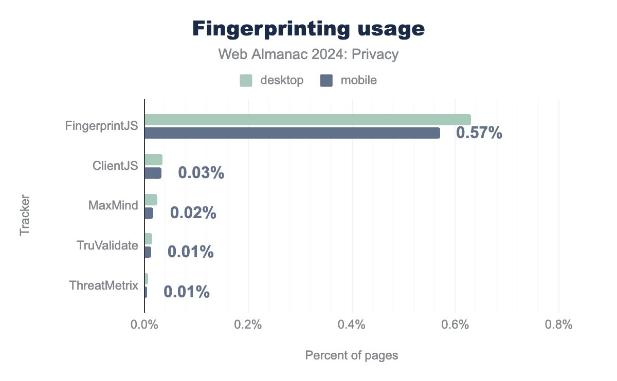 私たちの分析では、まず有名なフィンガープリントライブラリの存在を調べました。テストしたライブラリの中で、ウェブ上でフィンガープリントを実行するために使用されるもっとも普及しているライブラリはFingerprintJS(FingerprintJS)であり、全ウェブサイトの0.57%で見つかりました。これは、このライブラリがオープンソースであり、無料版があるためである可能性が高いです。2022年の測定値と比較すると、これらのフィンガープリントライブラリの使用はわずかに減少していますが、今年は約400万ページものウェブページをクロールしていることに注意することが重要です。
