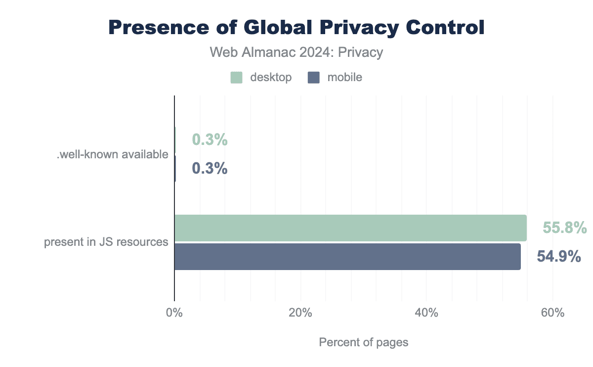 分析によると、デスクトップサイトの55.8%、モバイルサイトの54.9%でGPC信号がJavaScriptを介してアクセスでき、これはDNT信号よりも大幅に高いことがわかります。GPCのもう1つのオプション要件は、ウェブサイトのオリジンサーバーURLに対して相対的な/.well-known/gpc.jsonエンドポイントにあるウェルノウンURLです。このリソースは、ウェブサイトがGPCを認識し、サポートしていることを示すためのものですが、同時にGPCを遵守することを保証するものではありません。私たちの測定では、モバイルサイトとデスクトップサイトのわずか0.2%しか、アクセス可能なウェルノウンエンドポイントを持っていないことがわかりました。