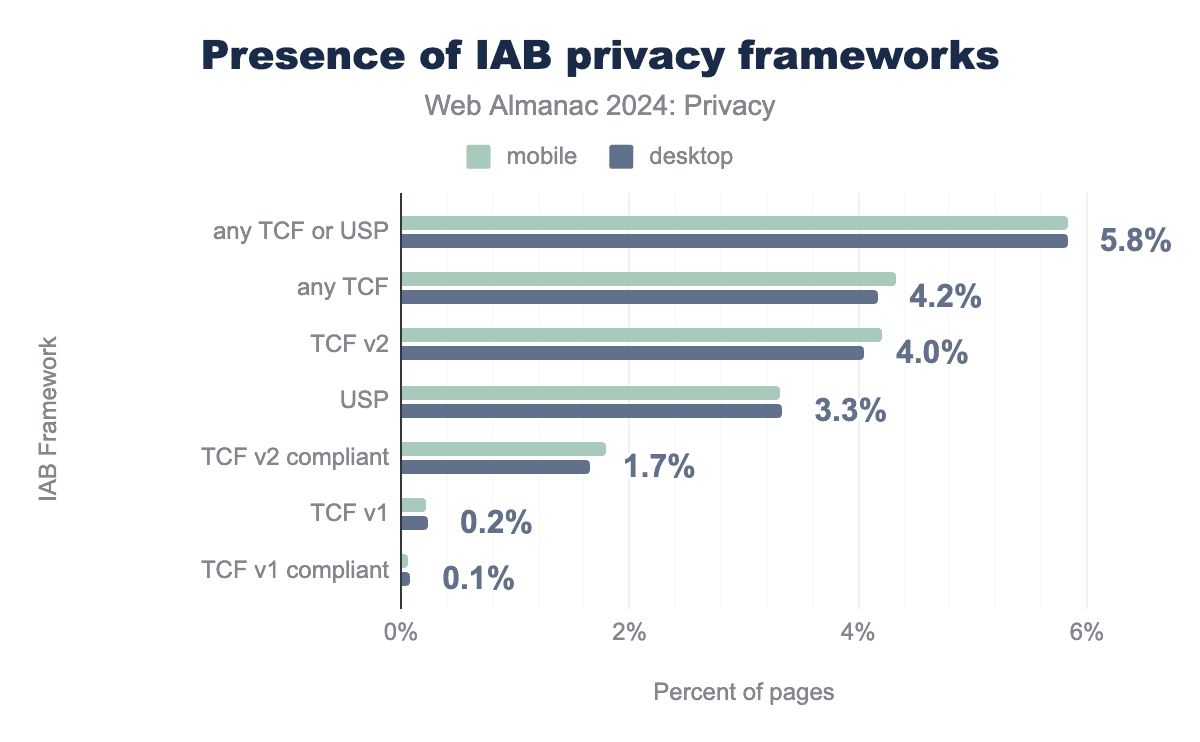 2024年のデータは、2022年と比較してプライバシーの状況が変化したことを明らかにしています。まず、IABフレームワーク全体の普及率が増加しました。2022年には、もっとも広範なIABのプレゼンス(「IAB all」)がページの4.4%(デスクトップとモバイルの合計)で見つかりました。2024年には、TCFまたはUSPフレームワークのいずれかがホームページの5.8%に表示されます。これは、規制の監視強化やユーザーの意識向上によって、プライバシー基準の採用が拡大していることを示唆しています。