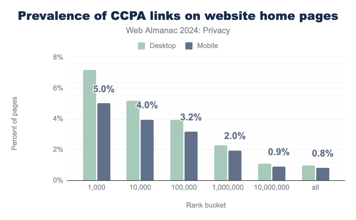 しかし、上位1,000のウェブサイトにおけるリンクの割合はわずか7.19%であり、これは非常に低い値です。これらのサイトのうち、CCPAの対象となる要件を満たしているサイトがいくつあるかを知ることは不可能ですが、上位ランクのウェブサイトの多くは少なくとも収益のしきい値を満たしている可能性が高いため、カリフォルニアのユーザーを積極的にブロックする措置を講じない限り、対象となっているように見えます。