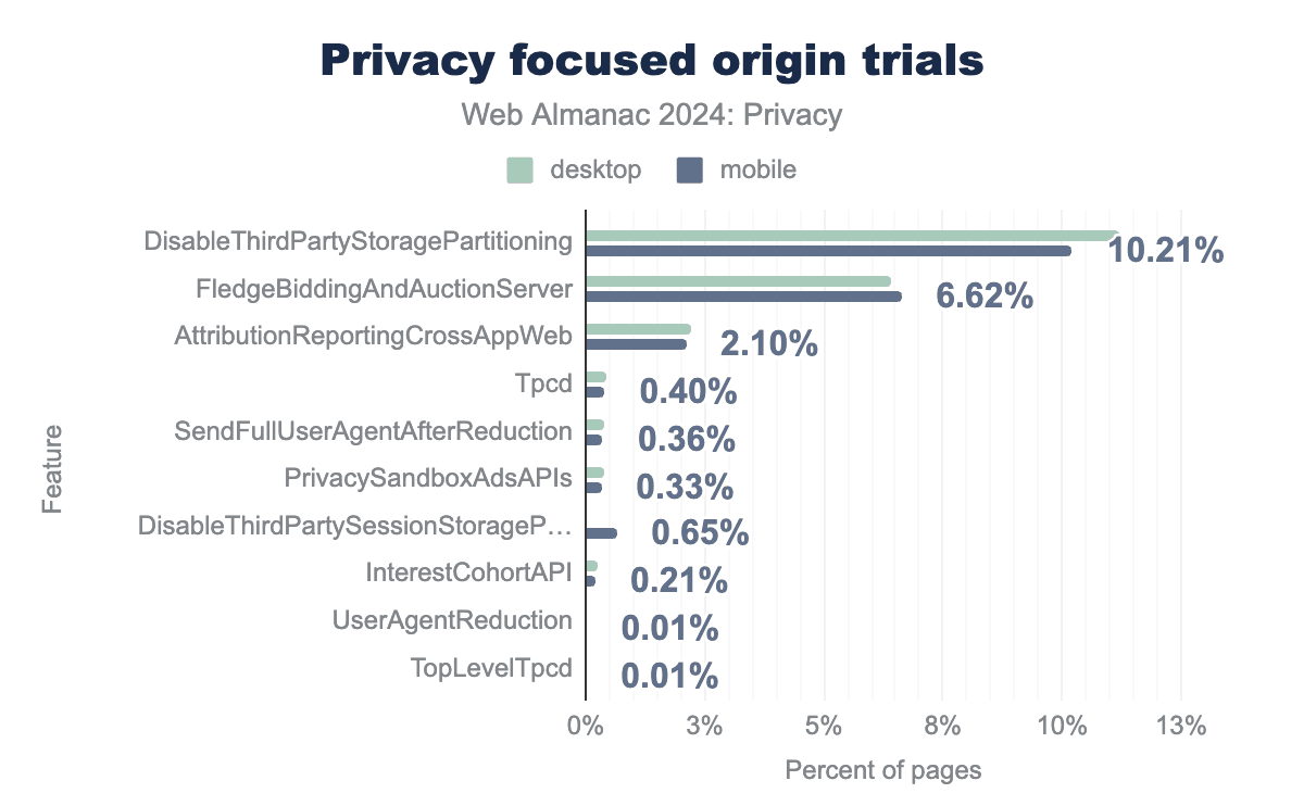 これは、ウェブサイトの10%以上が、サードパーティストレージのパーティショニングによって提供される利点を無効にする機能をテストしていることを意味します。ストレージパーティショニングは、Cookieを含まない一部のストレージ関連APIに適用されることに注意してください。2番目に普及しているトライアルはFledgeBiddingAndAuctionServerで、モバイルウェブサイトの6.62%以上で展開されています。