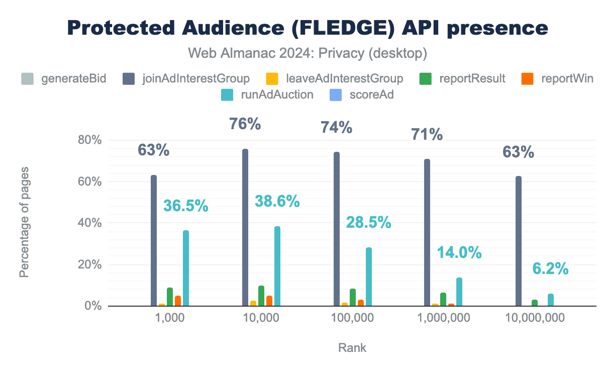 Protected Audience APIで利用可能なさまざまなメソッド呼び出しの中で、navigator.joinAdInterestGroup()がサードパーティサービスによってもっとも多く使用されていることがわかります(上位1,000万のウェブサイトの63%)。