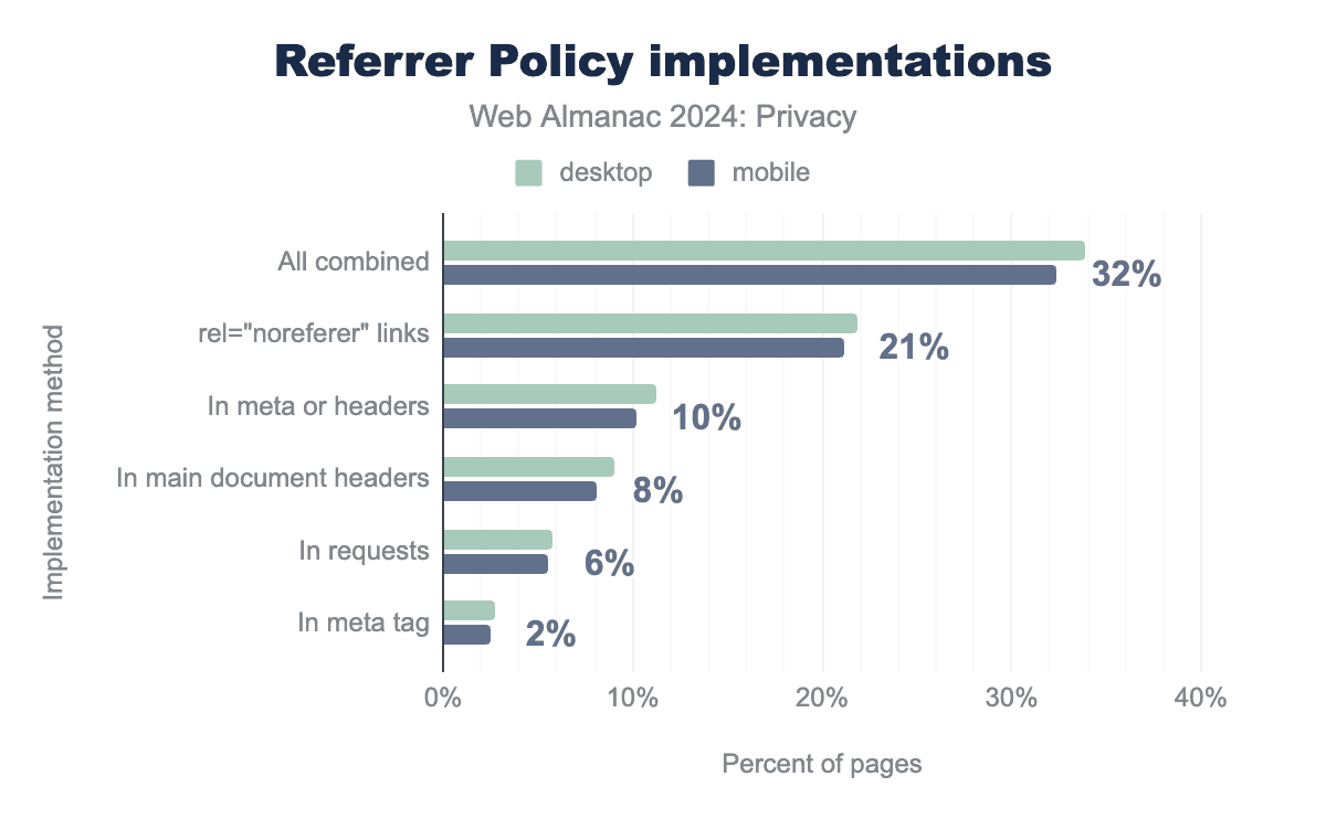 Referrer Policyは、ドキュメントレベルとリクエストレベルの両方で含めることができます。Referrer Policyは、デスクトップウェブページの33.87%、モバイルウェブページの32%で展開されていることがわかりました。そのようなページの21.82%では、Referrer Policyはref=noreferer HTMLタグを使用してリクエストレベルで展開されており、11.31%のインスタンスでは、Referrer Policyはドキュメントレベルで展開されています。