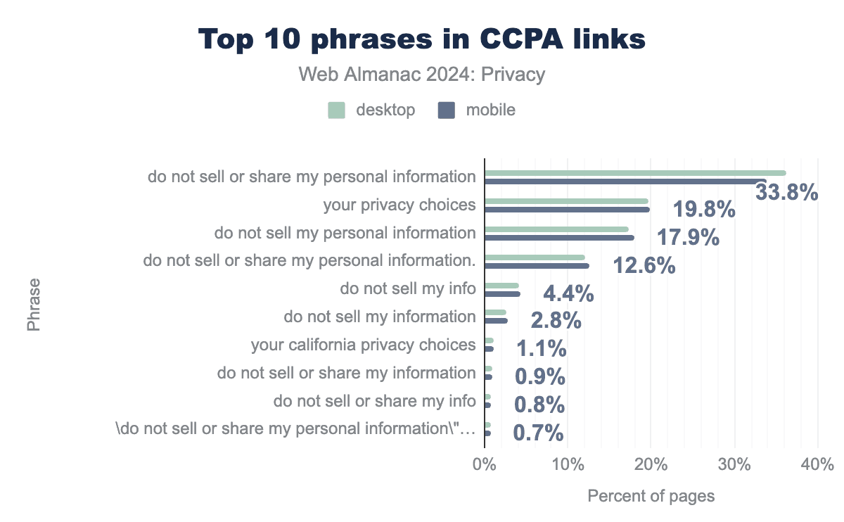 法律の下では、カリフォルニアで事業を行い、特定の規模のしきい値を満たす事業は、ユーザーが個人情報の販売または共有をオプトアウトする方法を提供しなければなりません。法律を遵守するため、カリフォルニア州司法長官室は、事業のホームページに「私の個人情報を販売しない」というテキストと標準化されたアイコンを含むリンクを配置することを推奨しています。一般的なCCPAリンクフレーズのセットを特定した先行研究に基づいて、人気度レベルに応じてサイト全体でのこれらのリンクの普及率の分析を実施しました。