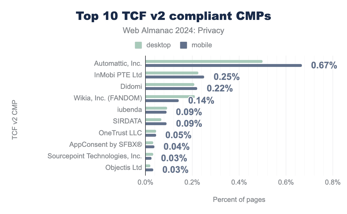 TCF v2エコシステム内での同意管理プラットフォーム(CMP)の使用状況の分析によると、Automattic, Inc.が採用をリードしており、ページの0.67%に表示され、InMobi PTE Ltdが0.25%、Didomiが0.22%でそれに続いています。これは、特定のCMPが同意を効果的に管理するために信頼されるようになったことを示唆していますが、採用率が比較的低いことは、多くのサイトがまだ社内ソリューションやあまり広く認識されていないCMPに依存している可能性があることを意味します。