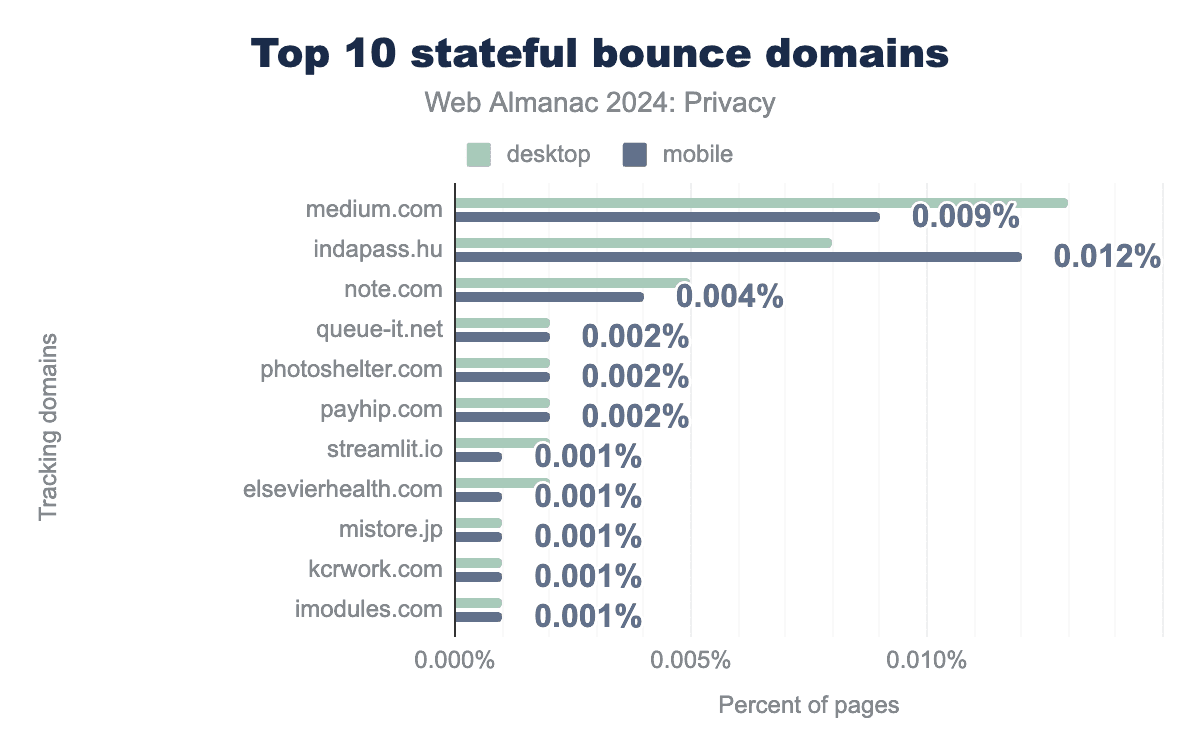 medium.com(モバイル0.009%または1,515ページ、デスクトップ0.013%または1,641ページで利用可能)とindapass.huIndaMedia)(モバイルページ0.012%または1,991ページ)がバウンストラッキングのようなナビゲーションでもっとも多く表示されることに注目します。これらの企業は、バウンストラッキングを使用して訪問者のグローバルなアイデンティティを管理し、訪問回数をカウントしてサービスを改善しています(MediumとIndaMediaは両方とも出版社です)。