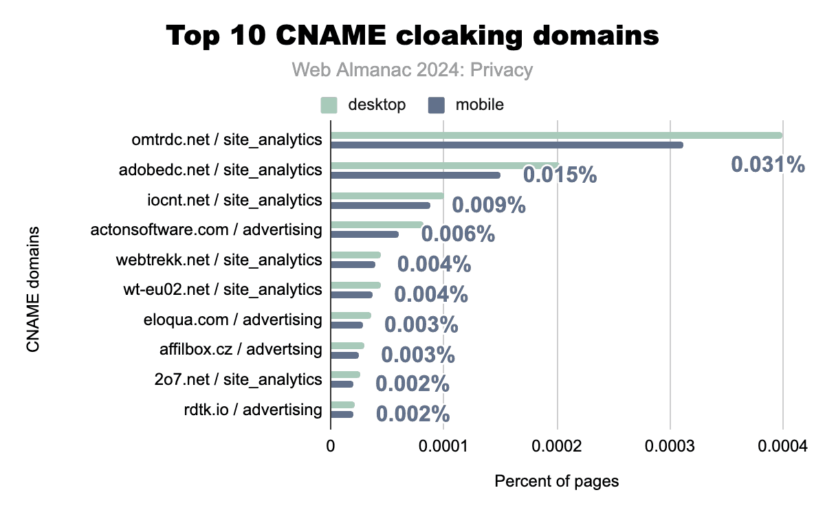 2024年のWeb Almanacデータは、CNAMEクローキングの継続的な傾向を明らかにしており、Adobe Analyticsに関連するomtrdc.netadobedc.netが、それぞれモバイルページの0.031%(約9,000)と0.015%(約4,500)以上で表示され、サイト分析カテゴリをリードしています。